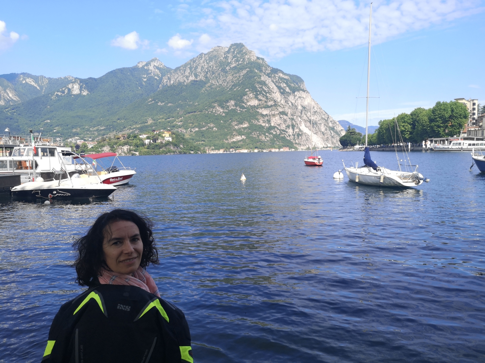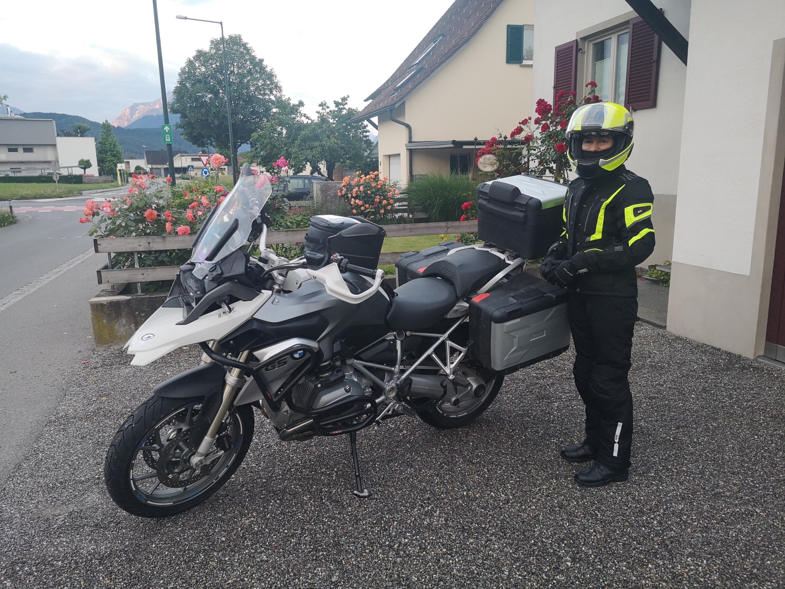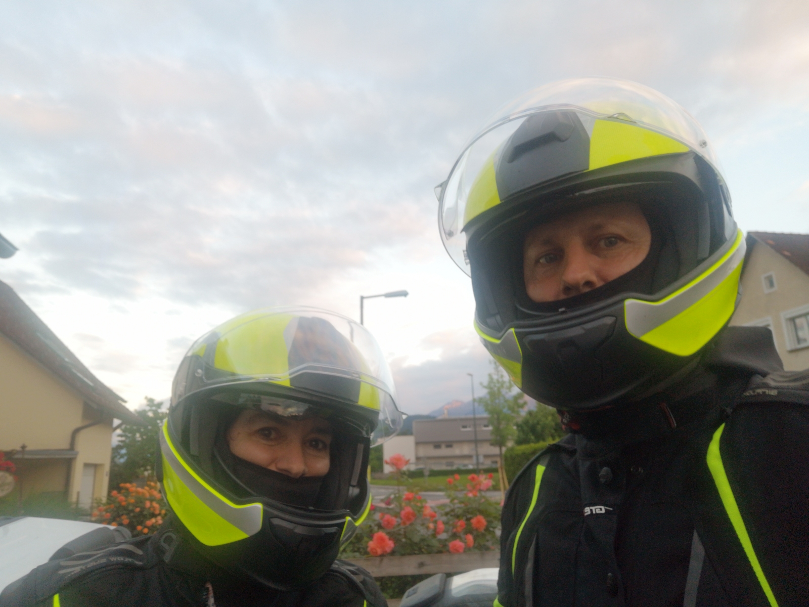 6.00 Uhr morgens – wir starten bei klarem Himmel nach verregneten und gewittrigen Tagen in Rankweil. Wie in der Fernsehküche stehen Stiefel, Handschuhe, Gepäck, Helme, … bereit – Daniel hat an alles gedacht. Über die Autobahn geht es in Richtung Chur, weiter bis nach Splügen und dann über den Splügenpass nach Italien. Auf dem Pass hat es 6° C und es ist neblig, kaum sind wir in Italien zeigt sich der blaue Himmel. 51 Kehren sind es vom Pass hinunter – das perfekte Aufwärmtraining für Motorrad, Fahrer und Sozius :-)) Unser zweites Frühstück nehmen wir um 8.30 Uhr bei 20° C in Chiavenna, Capucchino und Croissant schmecken großartig … lang ist es her, dass wir Bella Italia genießen durften …