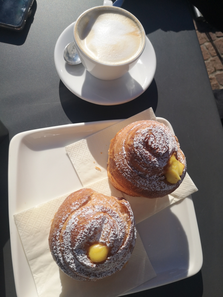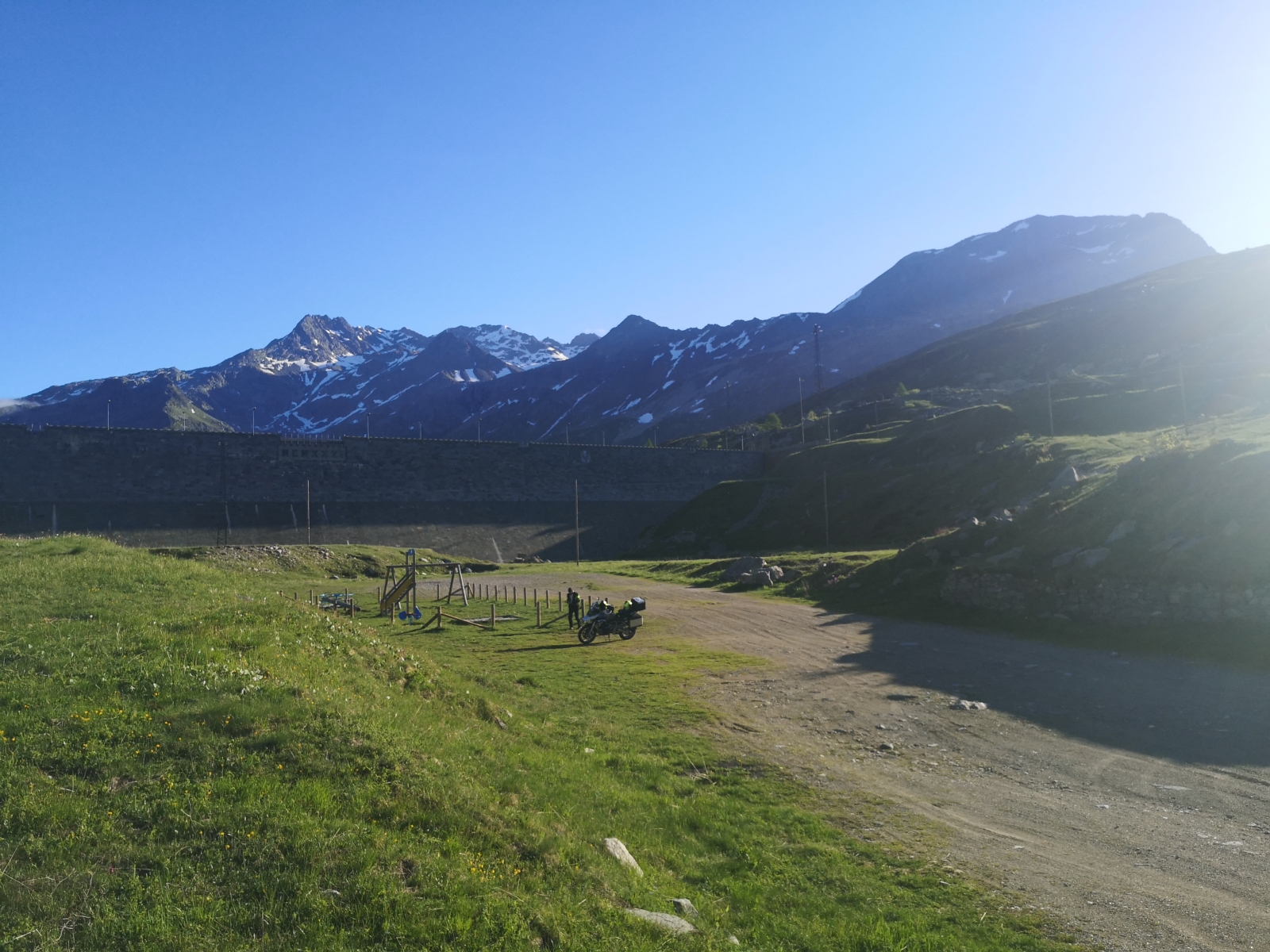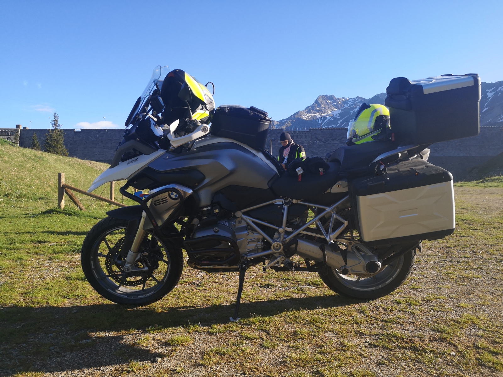 6.00 Uhr morgens – wir starten bei klarem Himmel nach verregneten und gewittrigen Tagen in Rankweil. Wie in der Fernsehküche stehen Stiefel, Handschuhe, Gepäck, Helme, … bereit – Daniel hat an alles gedacht. Über die Autobahn geht es in Richtung Chur, weiter bis nach Splügen und dann über den Splügenpass nach Italien. Auf dem Pass hat es 6° C und es ist neblig, kaum sind wir in Italien zeigt sich der blaue Himmel. 51 Kehren sind es vom Pass hinunter – das perfekte Aufwärmtraining für Motorrad, Fahrer und Sozius :-)) Unser zweites Frühstück nehmen wir um 8.30 Uhr bei 20° C in Chiavenna, Capucchino und Croissant schmecken großartig … lang ist es her, dass wir Bella Italia genießen durften …