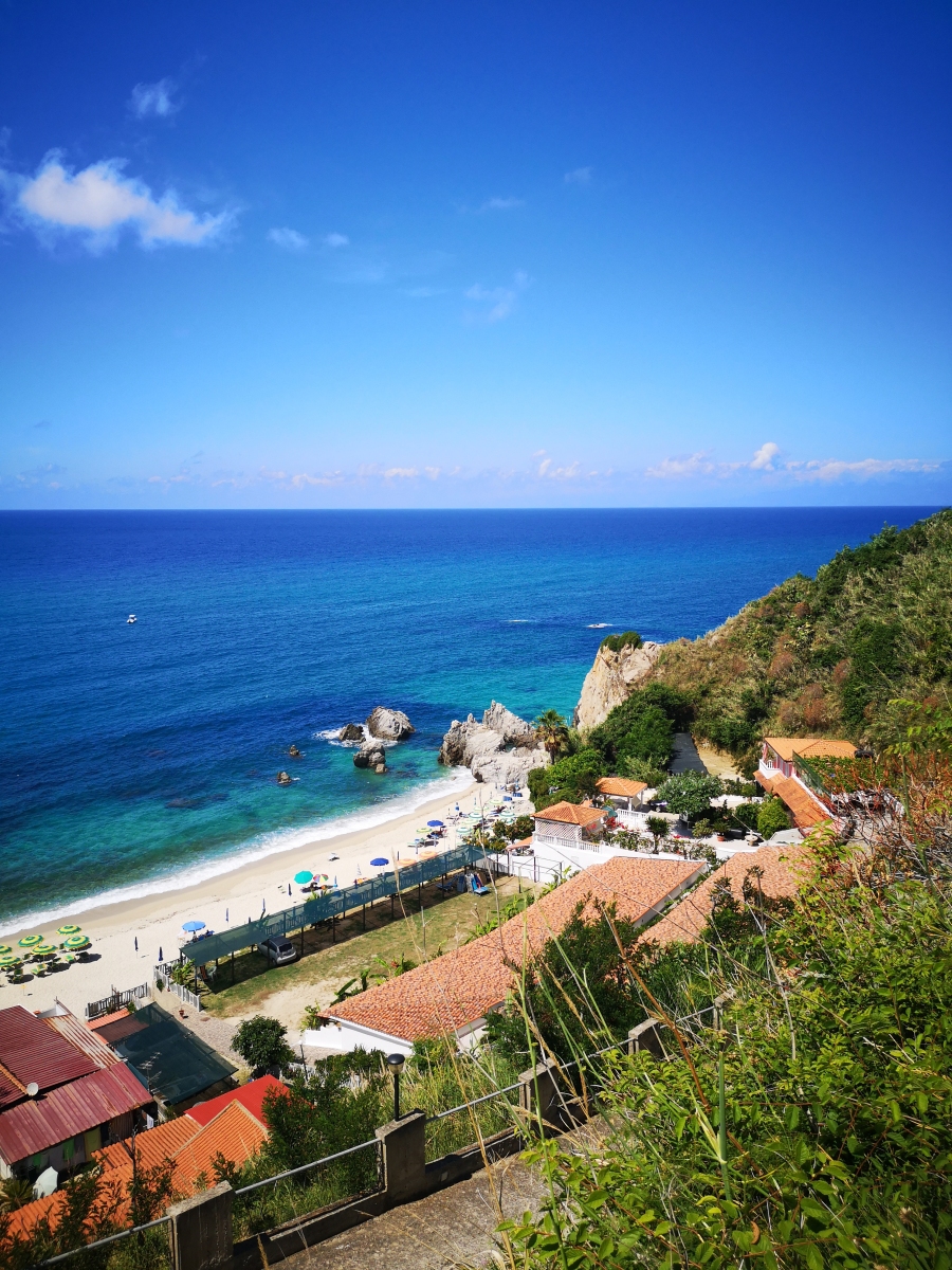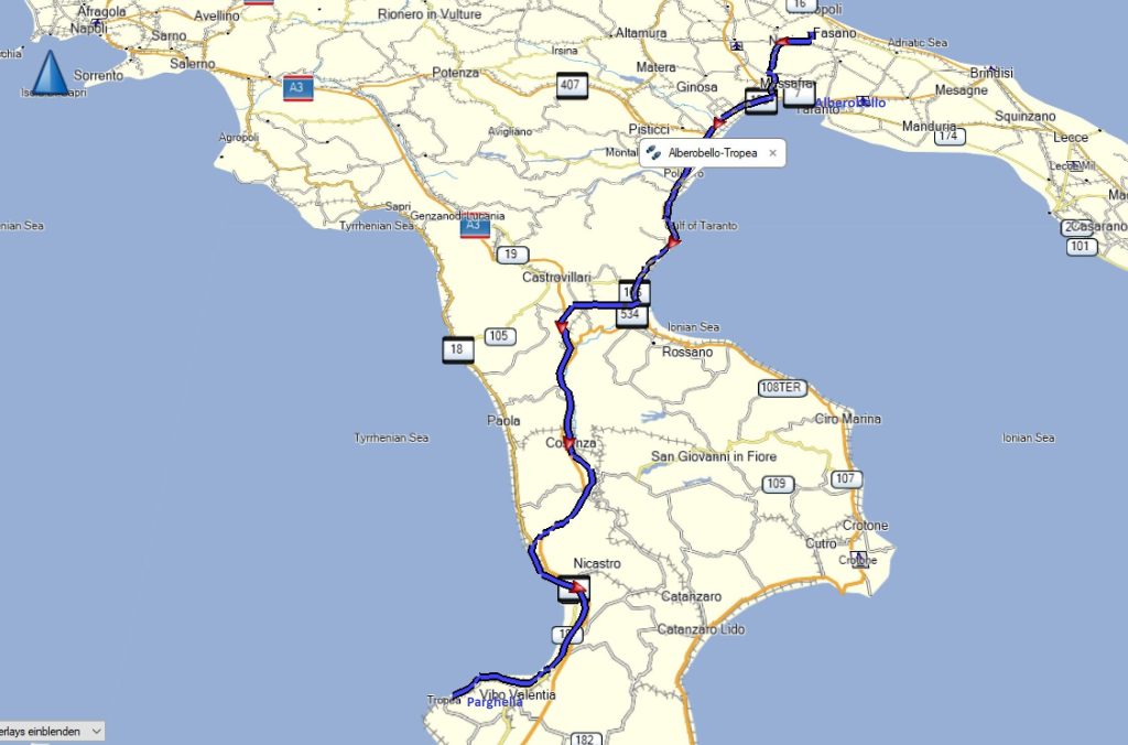 Die Fahrt nach Kalabrien ist landschaftlich sehr schön und abwechslungsreich. Durch Basilikata ein Stück („an der Fußsohle des Stiefels“) entlang des Ionischen Meeren und dann über („den Fußrist“) über die Berge an die Küste des Tyrrhenischen Meeres. Wälder, Forsithien, Bergdörfer und überall der Duft des Südens, – immer wieder wechselnd – ein Gemisch aus Nadelhölzern, Blüten, Früchten und Meer. Die Landschaft erinnert uns an die Toskana. Ausländische Touristen haben wir bis zum heutigen Tag kaum getroffen …