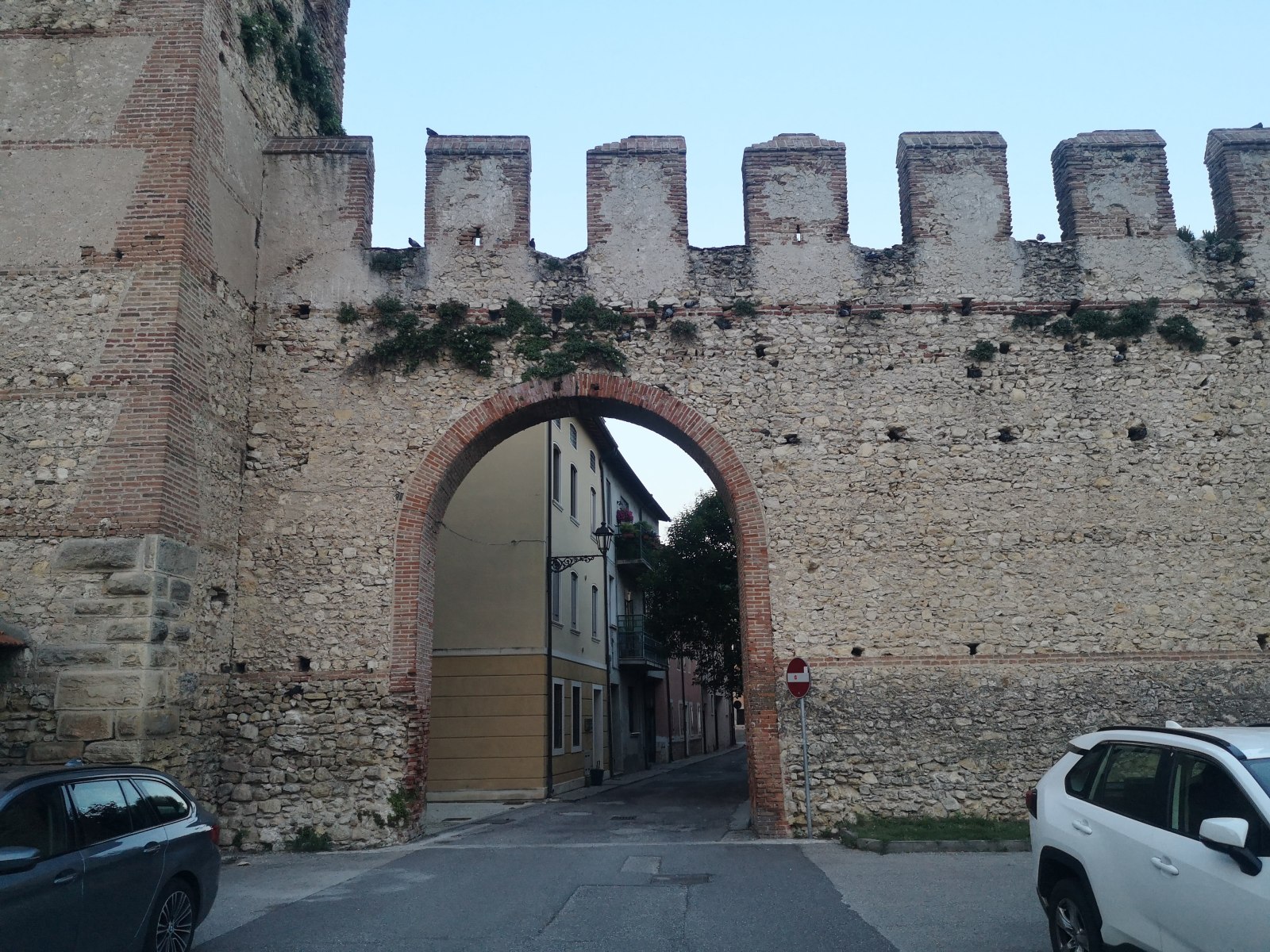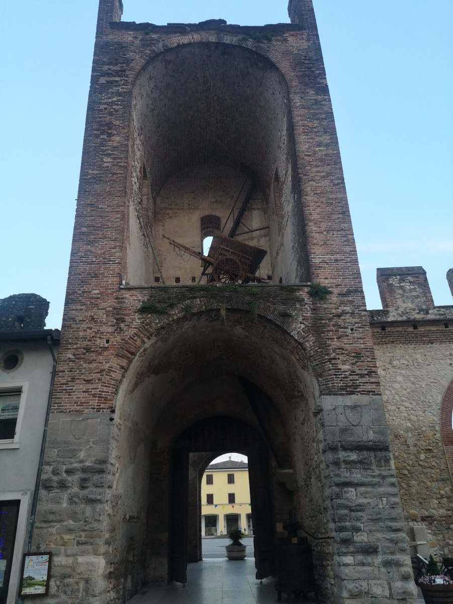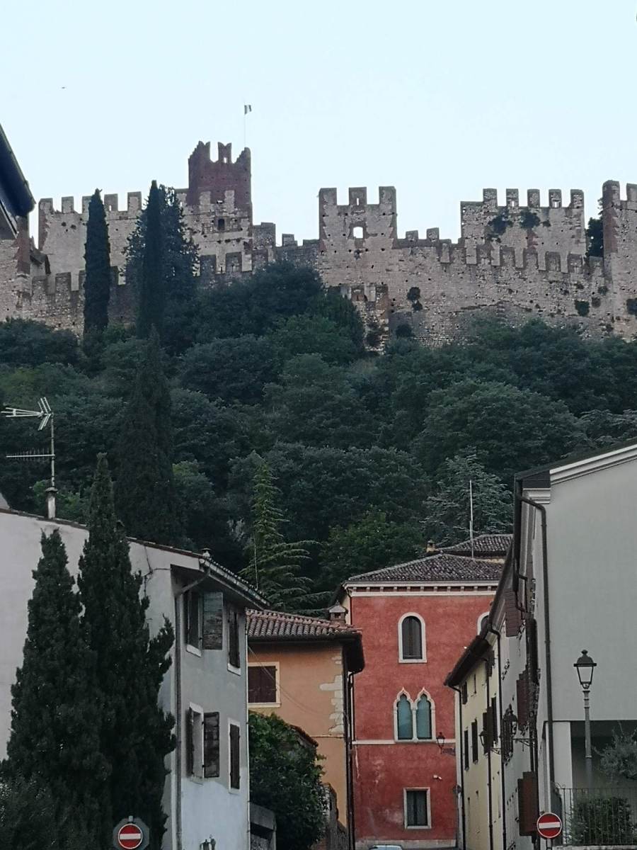 … nur das mit dem Abendessen ist ein Problem. Die zwei Lokale in der Nähe haben unerwarteterweise geschlossen. Taxis sind schwer zu bekommen. Tamara macht kurzerhand Autostopp – und zack, wir sitzen in einer ungarischen Limousine mit Ledersitzen. Sieben Kilometer später sind wir umgeben von der Stadtmauer der kleinen Stadt Soave. Die Burg direkt darüber soll 2021 zur schönsten Italiens gekürt worden sein (die Besichtigung geht sich heute nicht mehr aus).