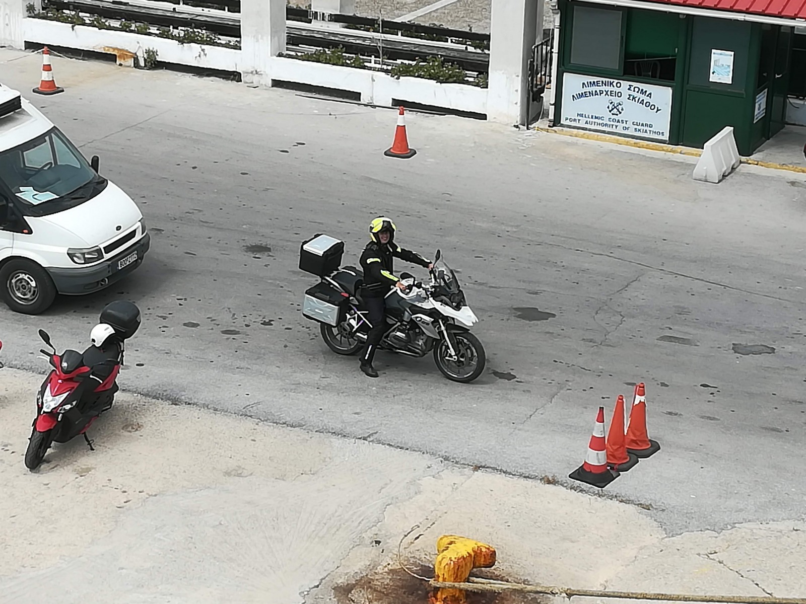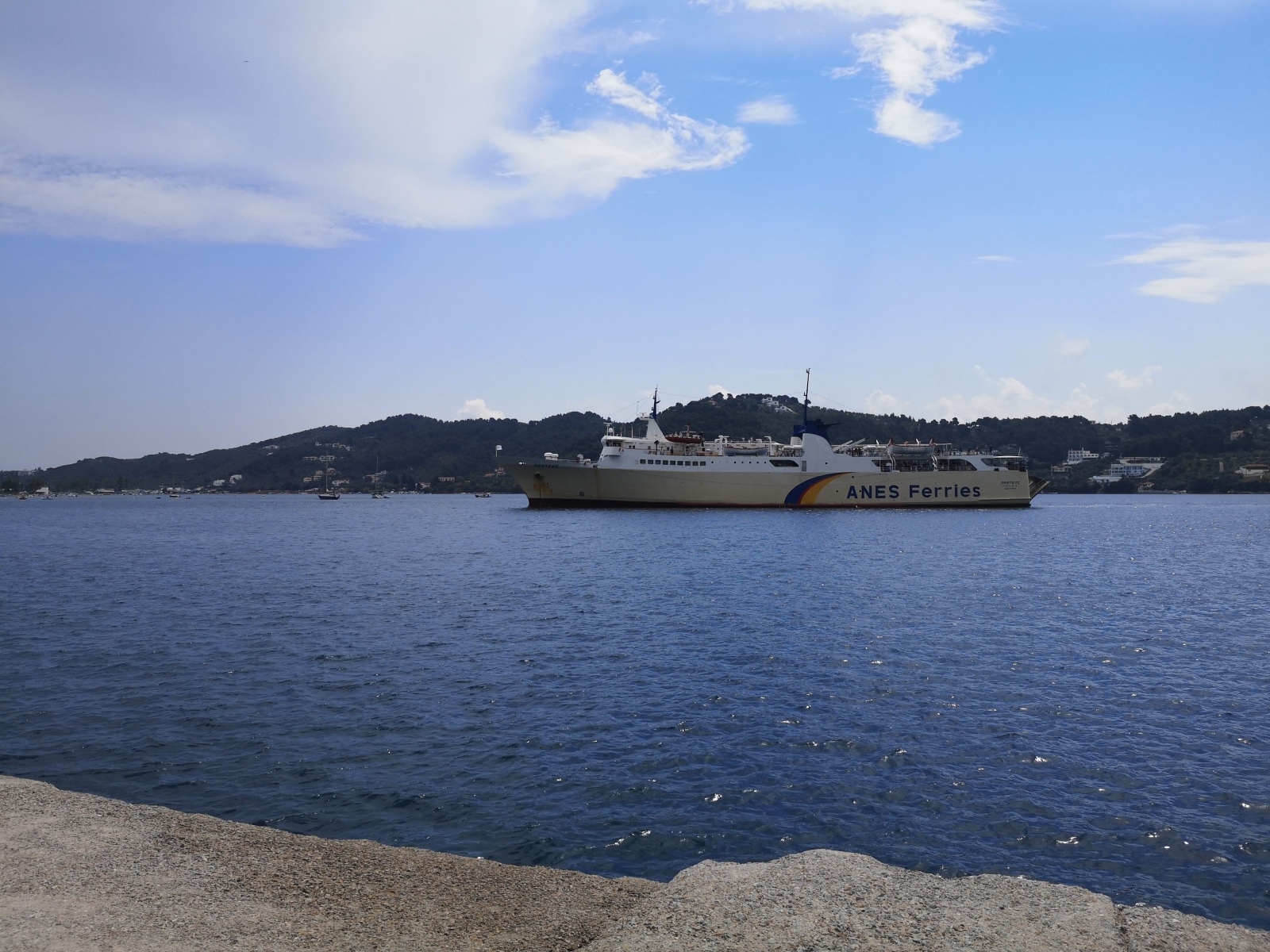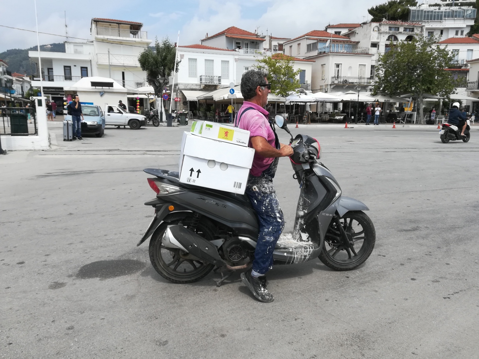 Mittwoch, 9.6.: Fährüberfahrt von Skiathos – Skopelos – nach Alonissos. Am Hafen beobachten wir eine von vielen abenteuerlichen Transporten auf der Insel: ein riesiges Paket auf dem Moped. Zuvor sichteten wir bereits einen riesigen Flachbildfernseher, kleine Kinder vorne auf dem Moped, die Omi hinten im “Damensitz” sowie utopisch große Grünmüllladungen mitgeführt auf Mopeds.