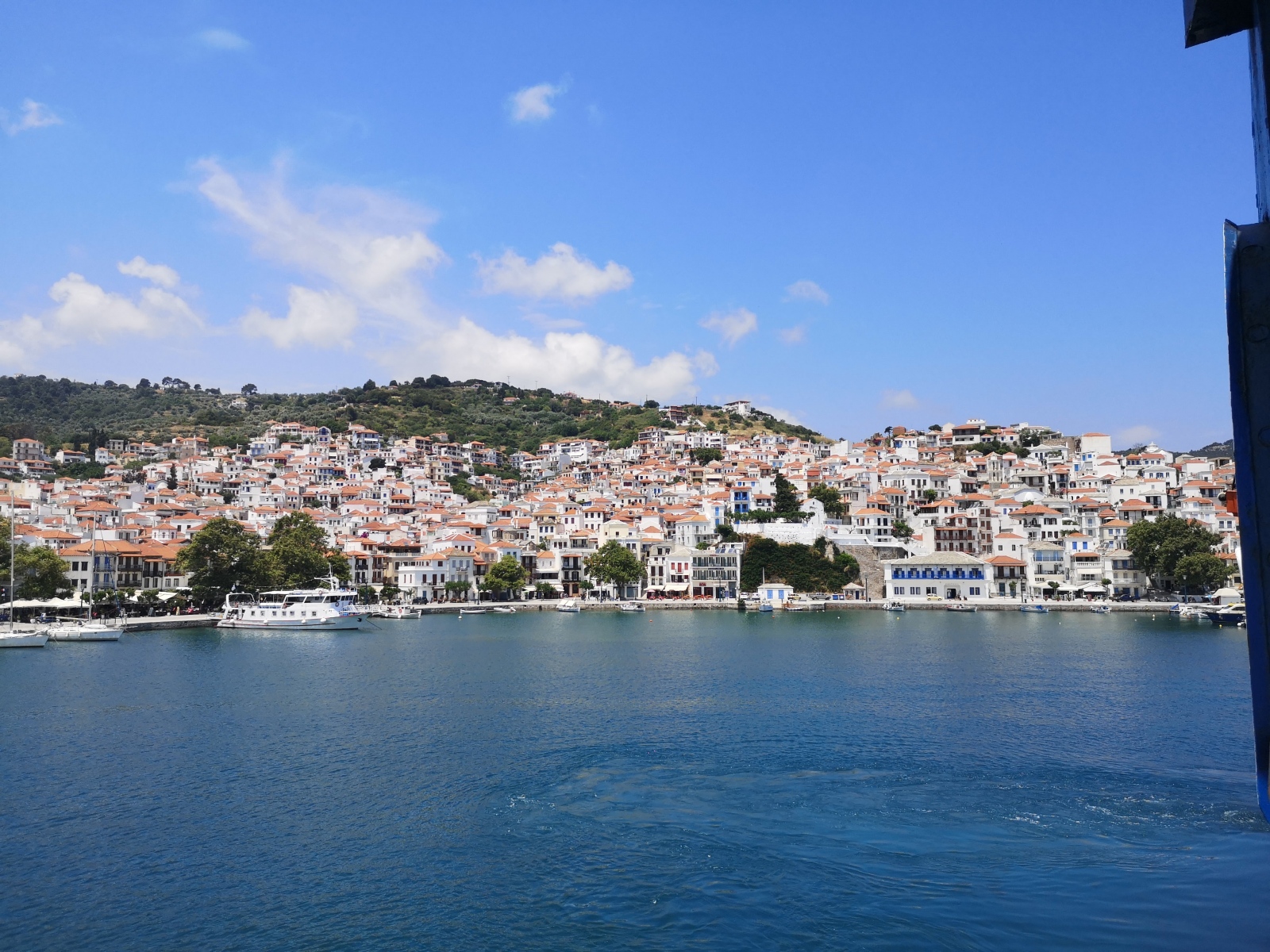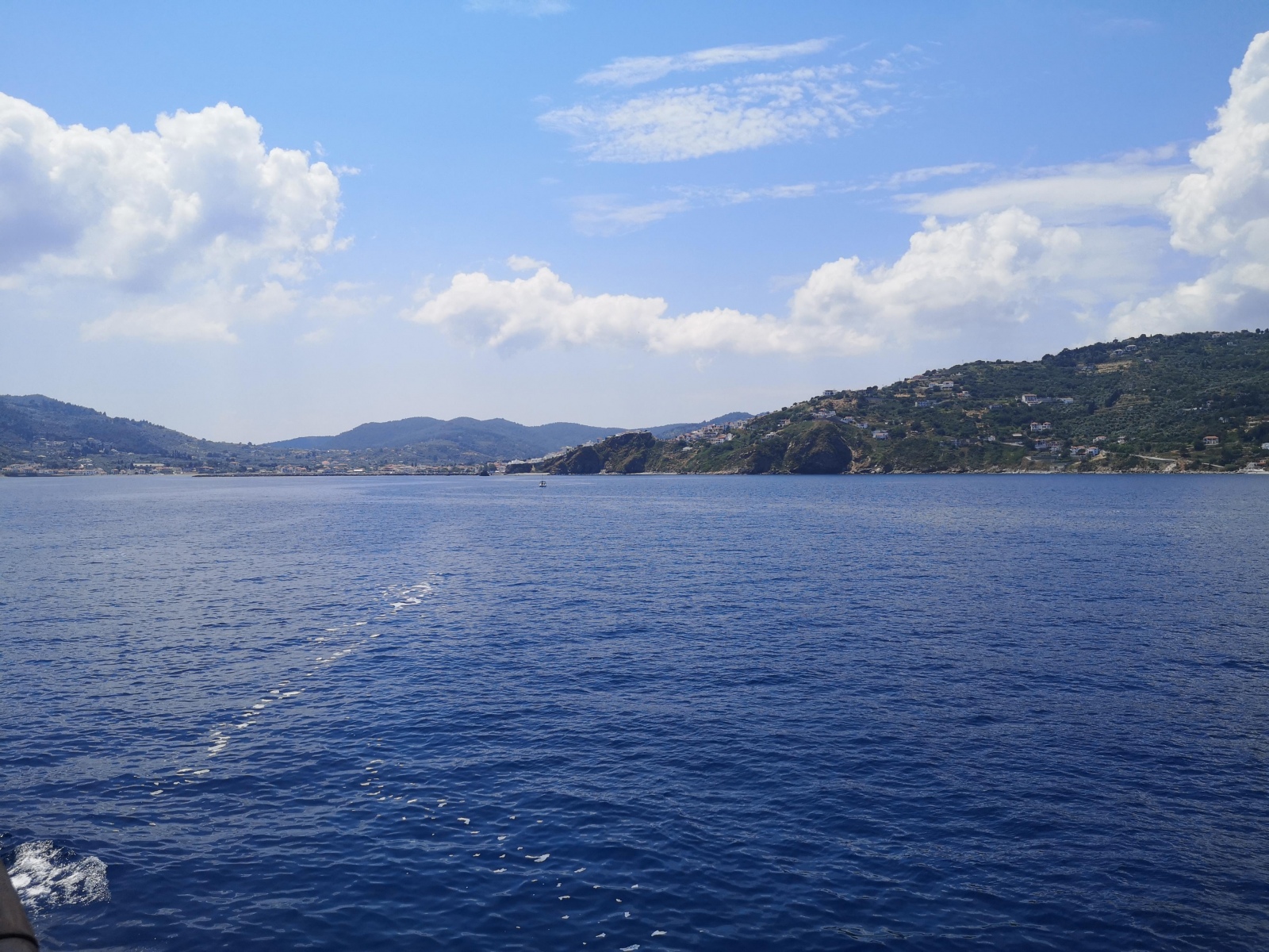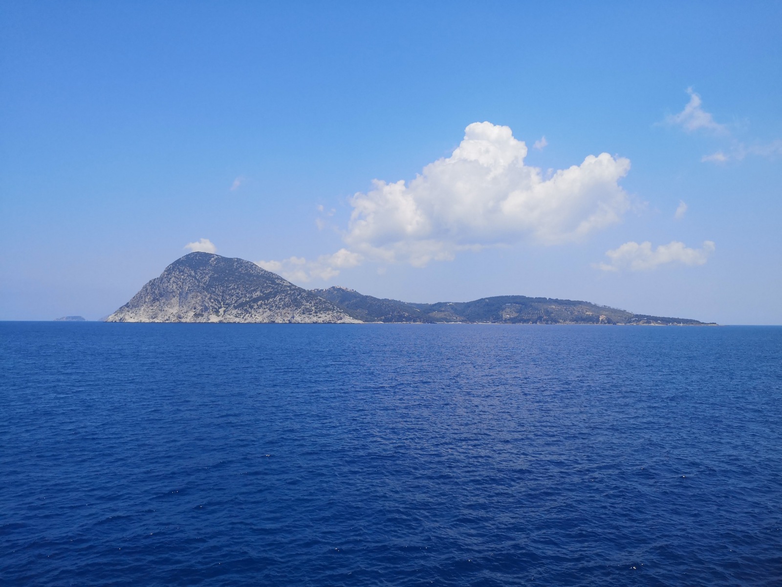 Mittwoch, 9.6.: Fährüberfahrt von Skiathos – Skopelos – nach Alonissos. Am Hafen beobachten wir eine von vielen abenteuerlichen Transporten auf der Insel: ein riesiges Paket auf dem Moped. Zuvor sichteten wir bereits einen riesigen Flachbildfernseher, kleine Kinder vorne auf dem Moped, die Omi hinten im “Damensitz” sowie utopisch große Grünmüllladungen mitgeführt auf Mopeds.