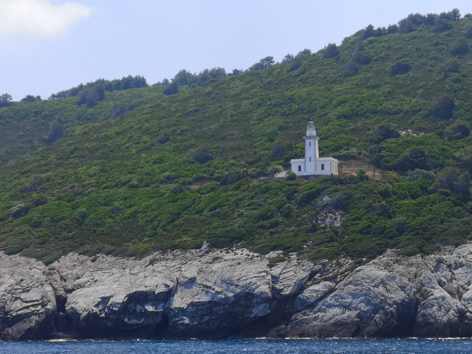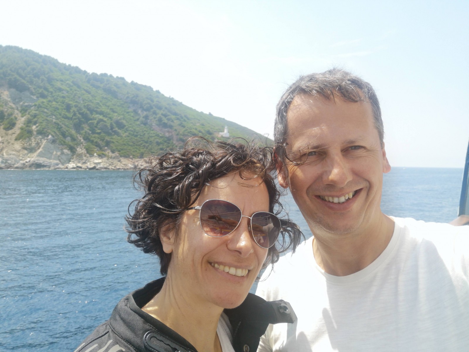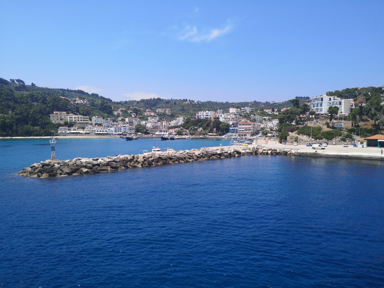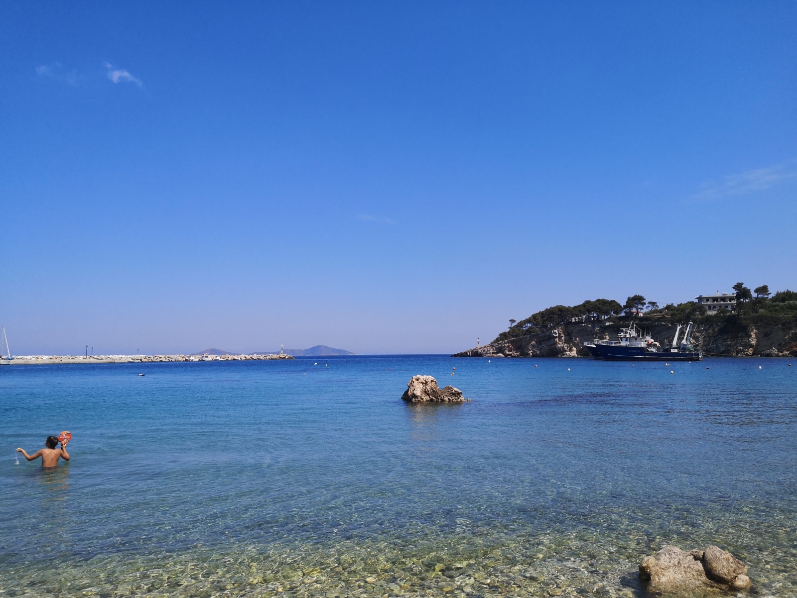 Auf Alonissos werden wir bereits von Angelos erwartet und wir beziehen unser Zimmer am Hang mit Blick auf das Meer. Zwei Leuchttürme dienen der Orientierung zur Hafeneinfahrt, das Wasser ist selbst im Hafen so klar, dass die Jungs der Insel und Daniel gleich hier hineinspringen.