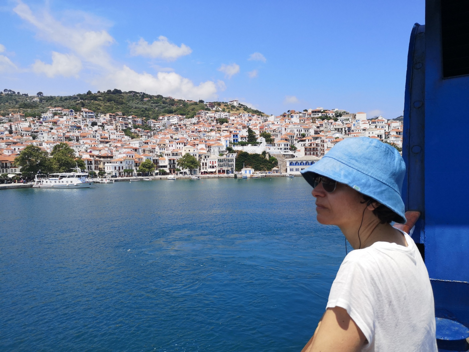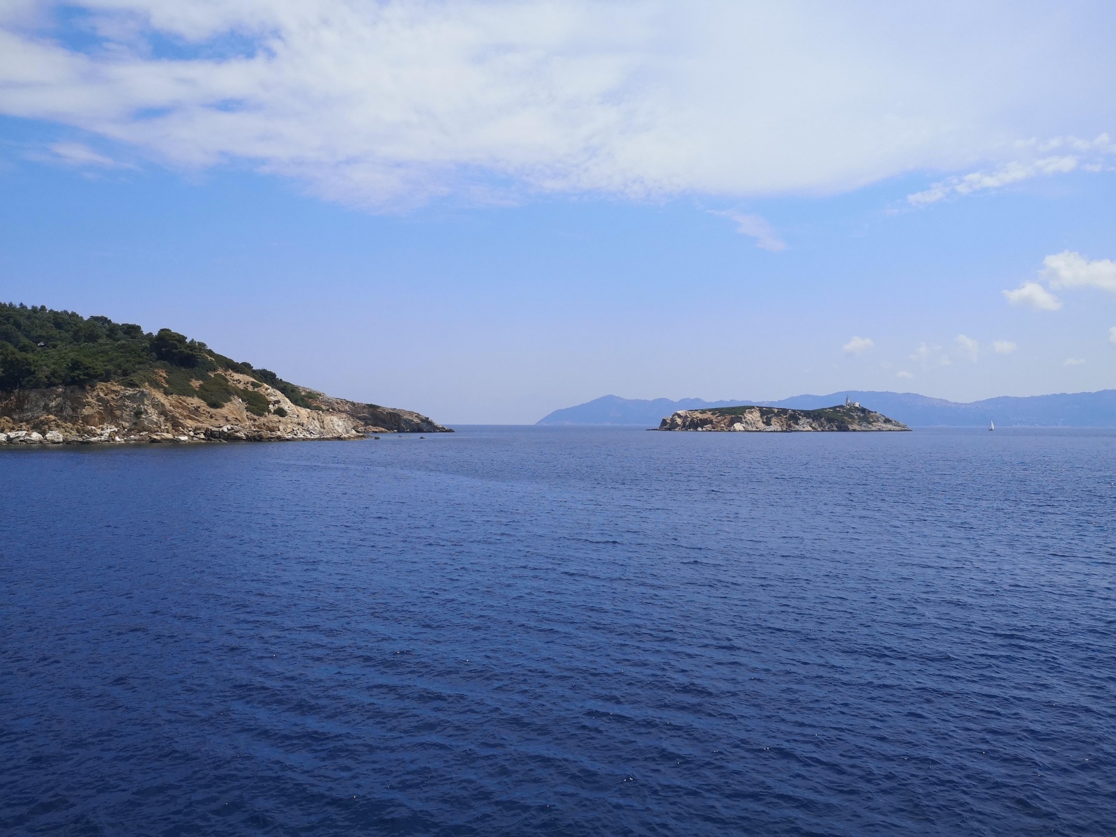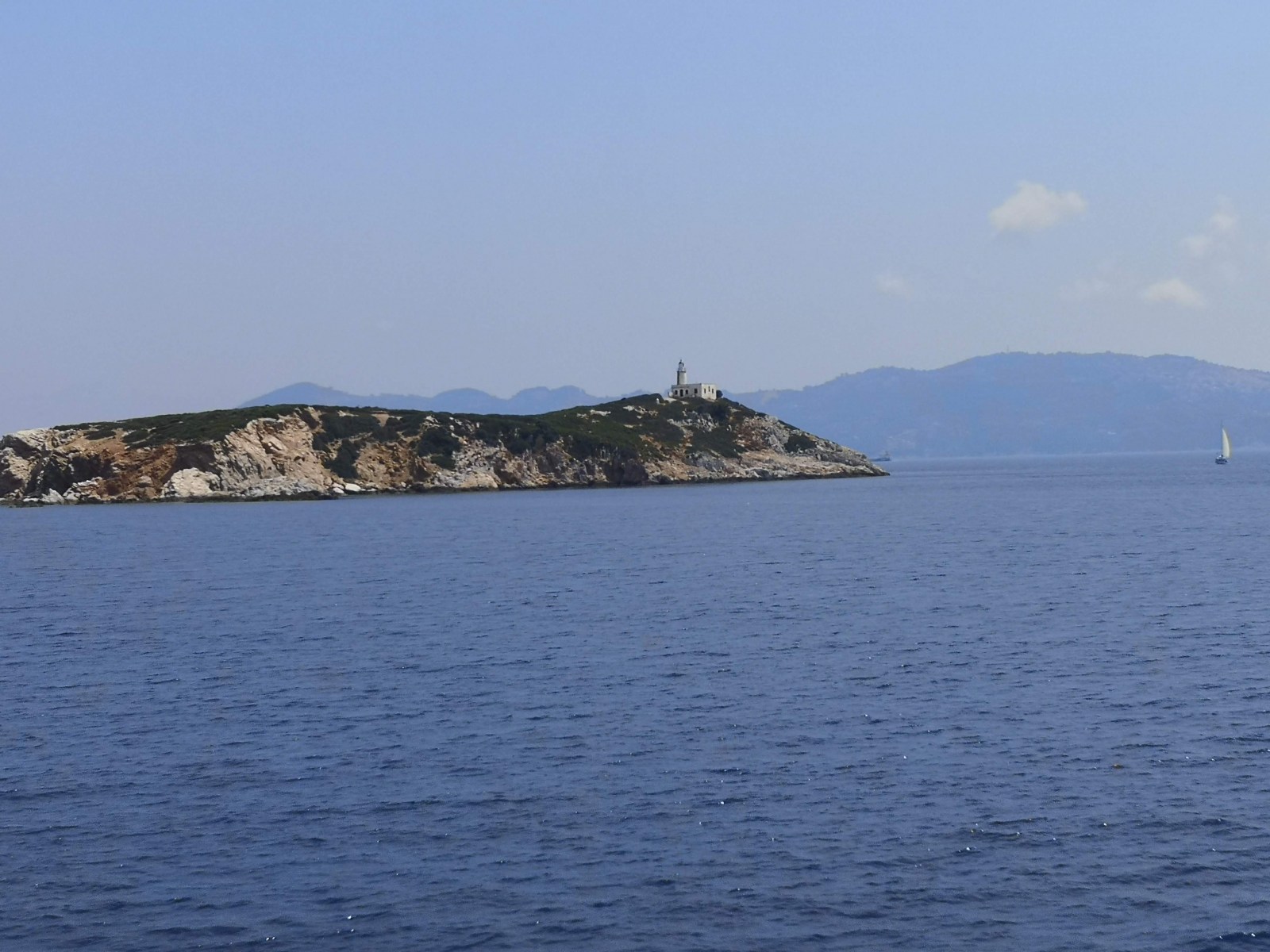 Auf Alonissos werden wir bereits von Angelos erwartet und wir beziehen unser Zimmer am Hang mit Blick auf das Meer. Zwei Leuchttürme dienen der Orientierung zur Hafeneinfahrt, das Wasser ist selbst im Hafen so klar, dass die Jungs der Insel und Daniel gleich hier hineinspringen.