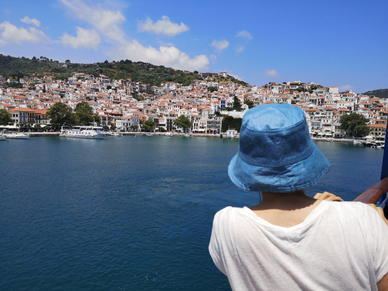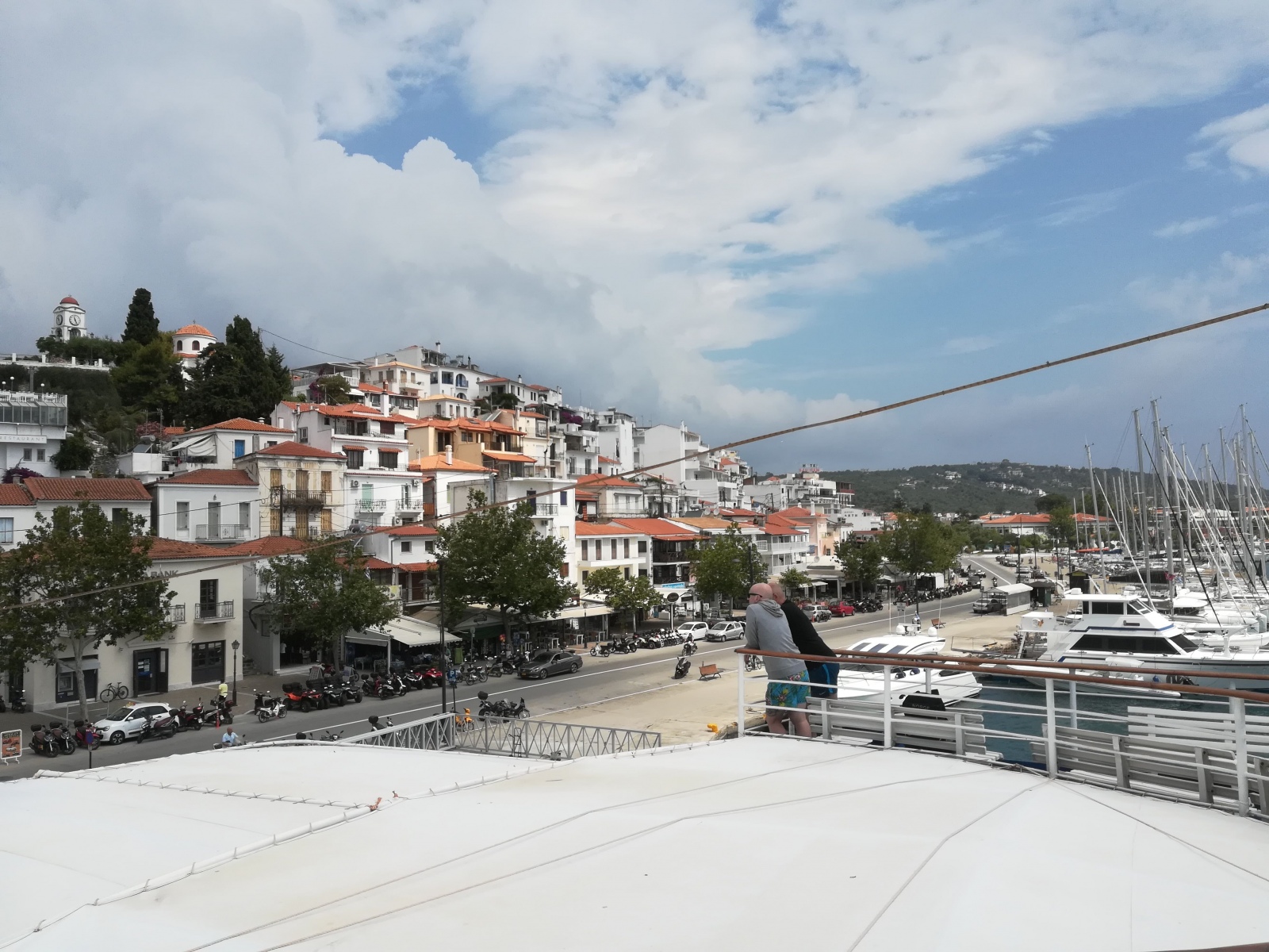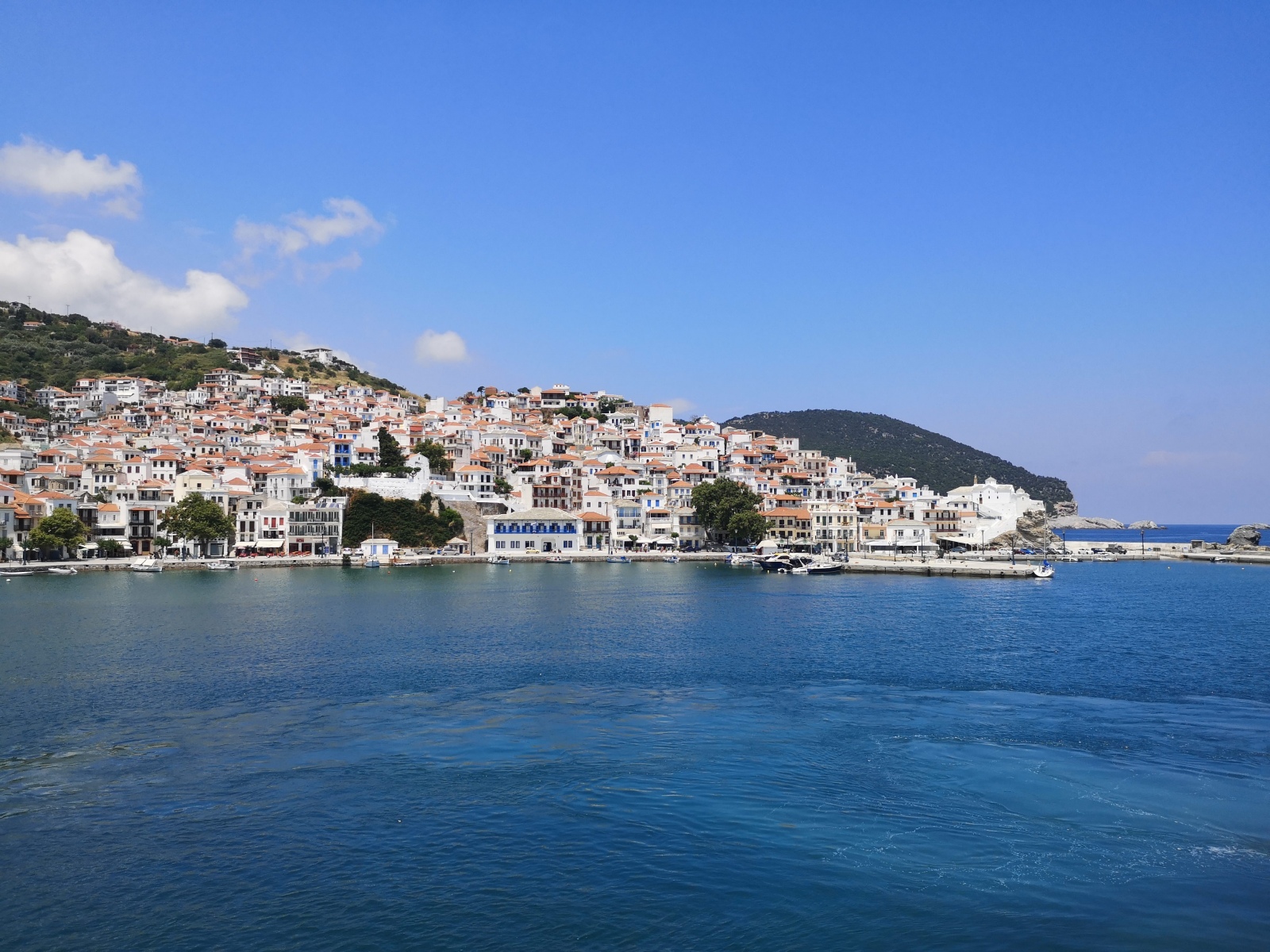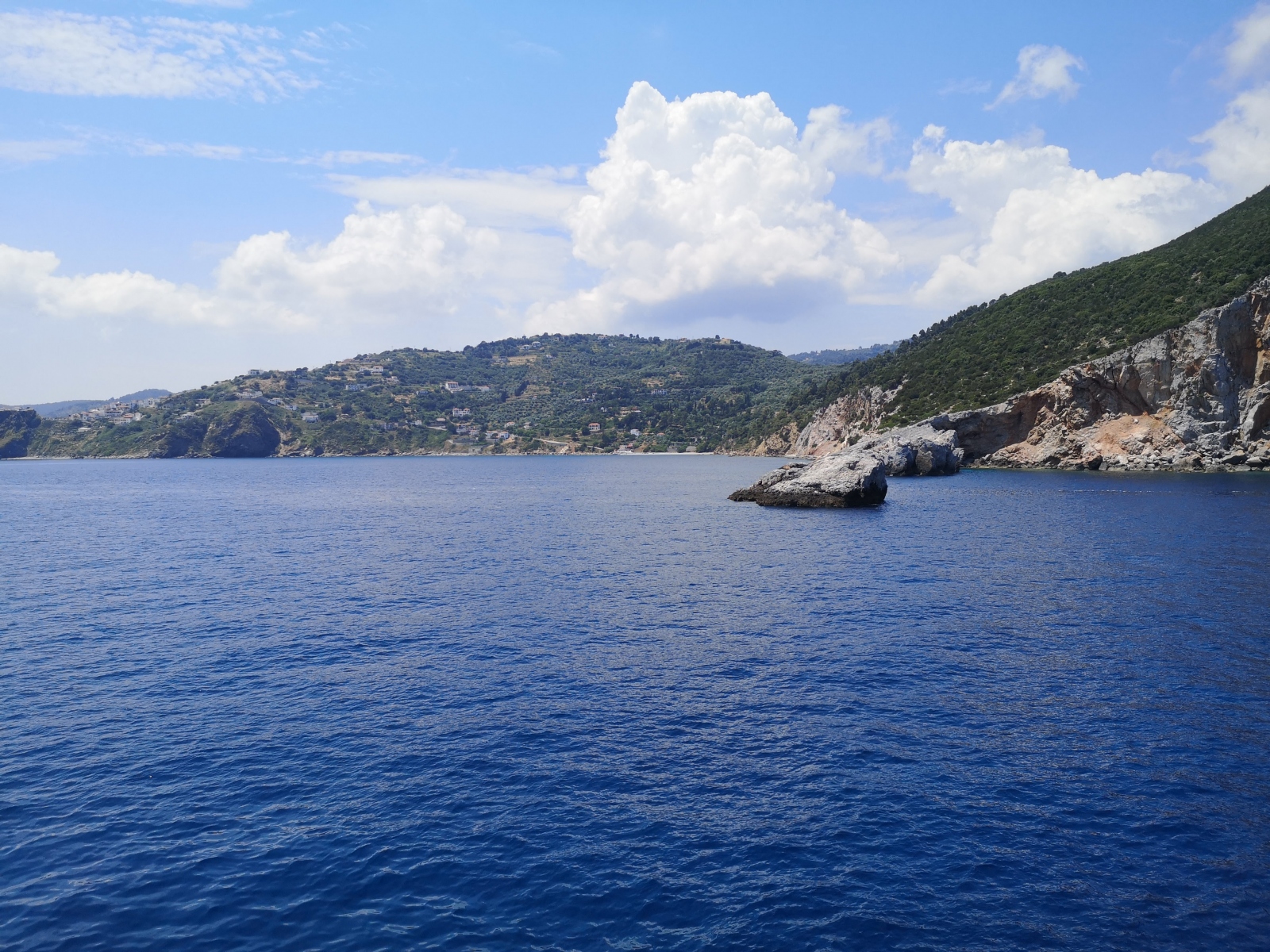 Auf Alonissos werden wir bereits von Angelos erwartet und wir beziehen unser Zimmer am Hang mit Blick auf das Meer. Zwei Leuchttürme dienen der Orientierung zur Hafeneinfahrt, das Wasser ist selbst im Hafen so klar, dass die Jungs der Insel und Daniel gleich hier hineinspringen.